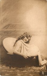 girl facing & looking forward, covered by towel in portable bathtub, her left hand holds towel to right cheek