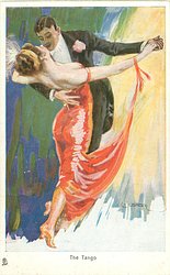 dancing the tango, woman in red dress, they face each other & almost kiss