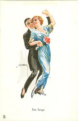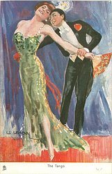 dancing the tango, woman in red/purple dress, they face front kneeling