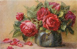 five open red roses in pewter vase with dent in front, six petals to left on ground