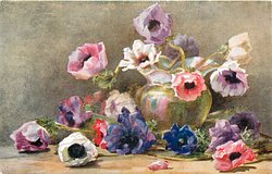bluish green vase surrounded by anemones lying on the ground, in the vase the flowers are pink, white and purple