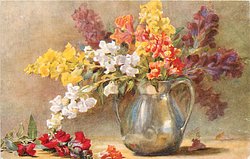 double handled pewter vase of antirrhinums of many colours, many flowers on floor left of bowl, but only two to right