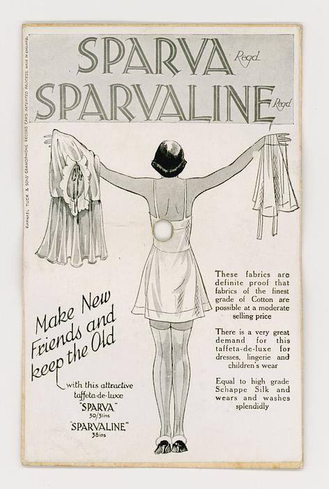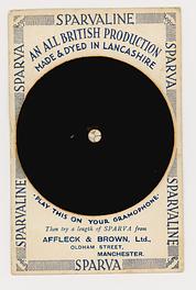 SPARVALINE SPARVA inscribed round margins AN ALL BRITISH PRODUCTION MADE AND DYED IN LANCASHIRE "PLAY THIS ON YOUR GRAMOPHONE" THEN TRY A LENGTH OF SPARVA FROM HENRY GLAVE LTD., 80/88 NEW OXFORD STREET, LONDON W.C. ( SPARVA is A Silk Fabric)