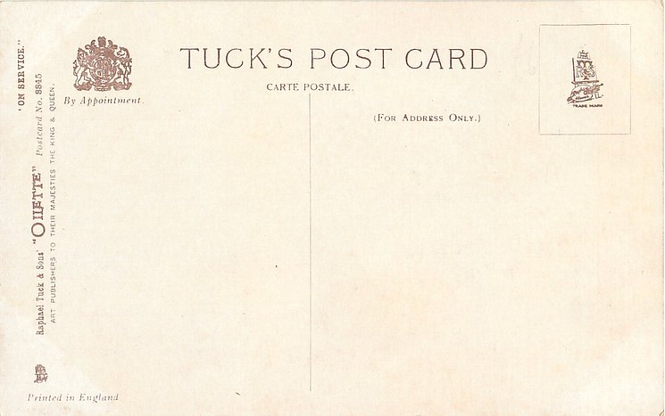 OILETTE, come Oilfacsim but not so trade-named. PRINTED IN ENGLAND or PRINTED IN UNITED KINGDOM with or w/o COPYRIGHT LONDON, listed in 1908/1909 &1911/1912 & 1912/1913 & 1913/1914 & 1926/1927 POSTCARD Catalogues & in 1932 ART SERVICE Catalogue