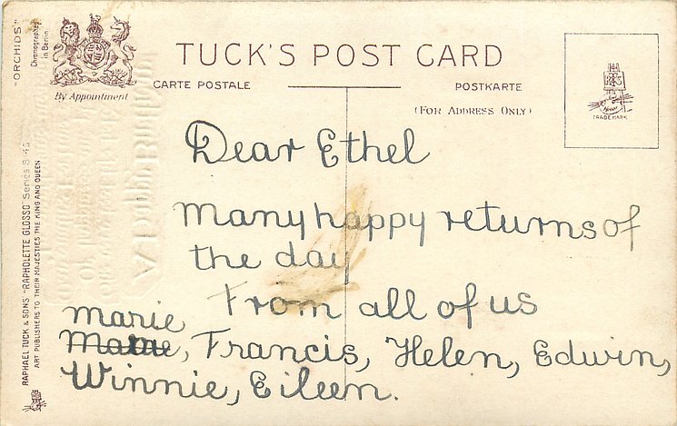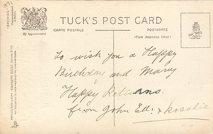 comes opt. in red BIRTHDAY GREETINGS or opt. in blue MANY HAPPY RETURNS OF A HAPPY DAY or A HAPPY EASTER on back
