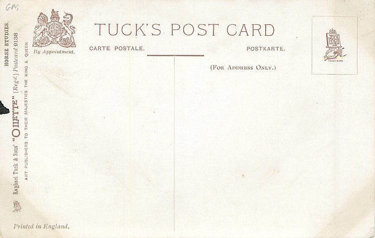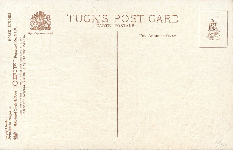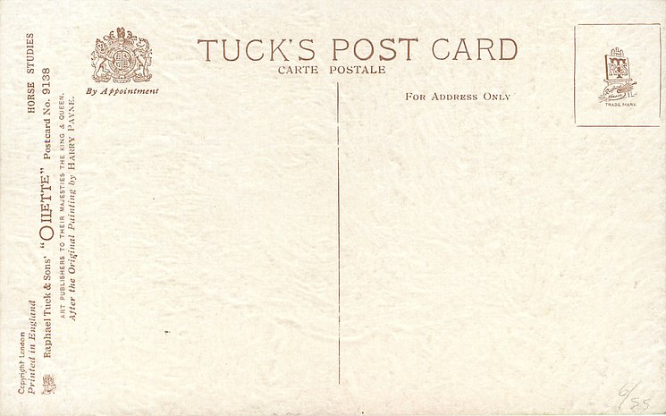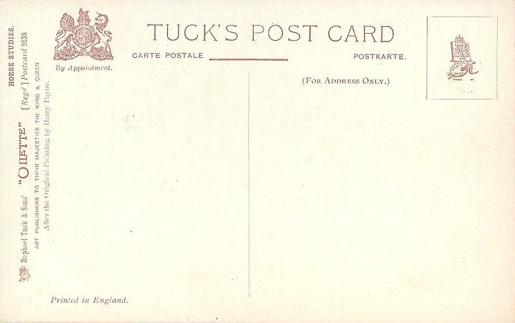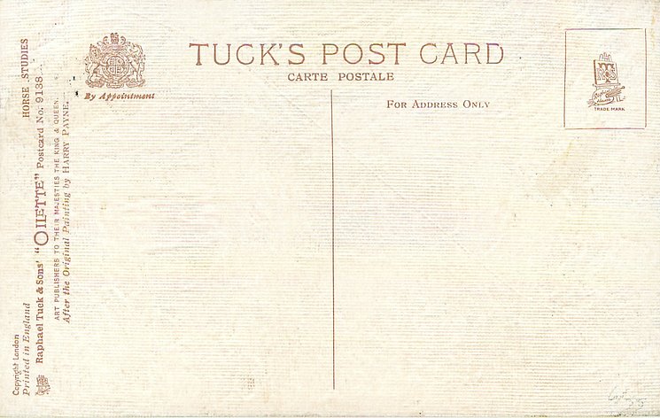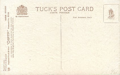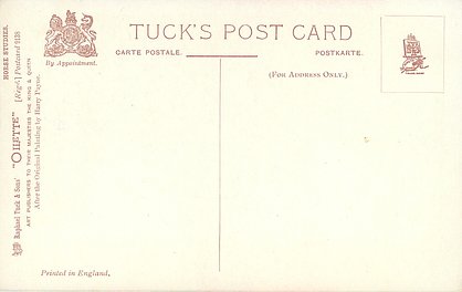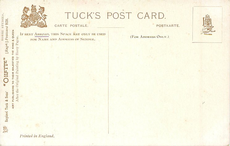 OILETTE, PRINTED IN ENGLAND, COPYRIGHT LONDON, come oilfacsim but not so trade named, come opt.AMEICAN Y.M.C.A., AFTER THE ORIGINAL PAINTING BY HARRY PAYNE, PRINTED IN THE UNITED KINGDOM, listed in1911/1912 & 1912/1913 & 1913/1914 & 1926/1927 & 1930 POSTCARD Catalogues
