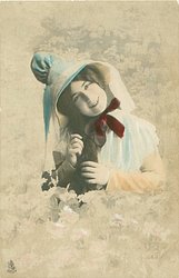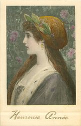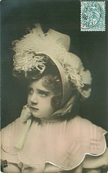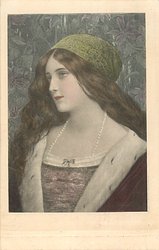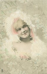 head & shoulders study of young girl, curly hair, hat with bow under chin