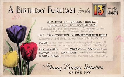REAL PHOTOGRAPH, PRINTED IN ENGLAND listing QUALITIES, USUAL CHARACTERISTICS, LUCKY NUMBERS, GEM, FLOWER, COLOUR, LUCKY DAYS, DESTINY YEARS