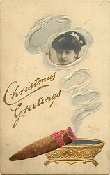 CHRISTMAS cigar in ashtray, pretty girl face inset into smoke